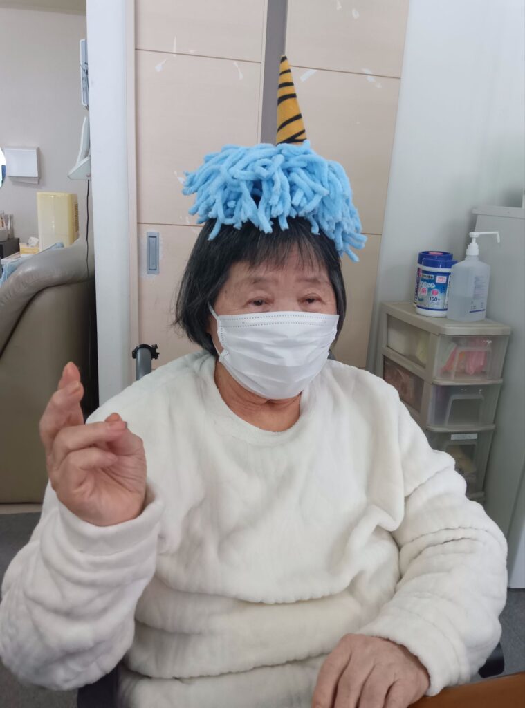 毛糸で作った鬼の頭を被ってみました😀